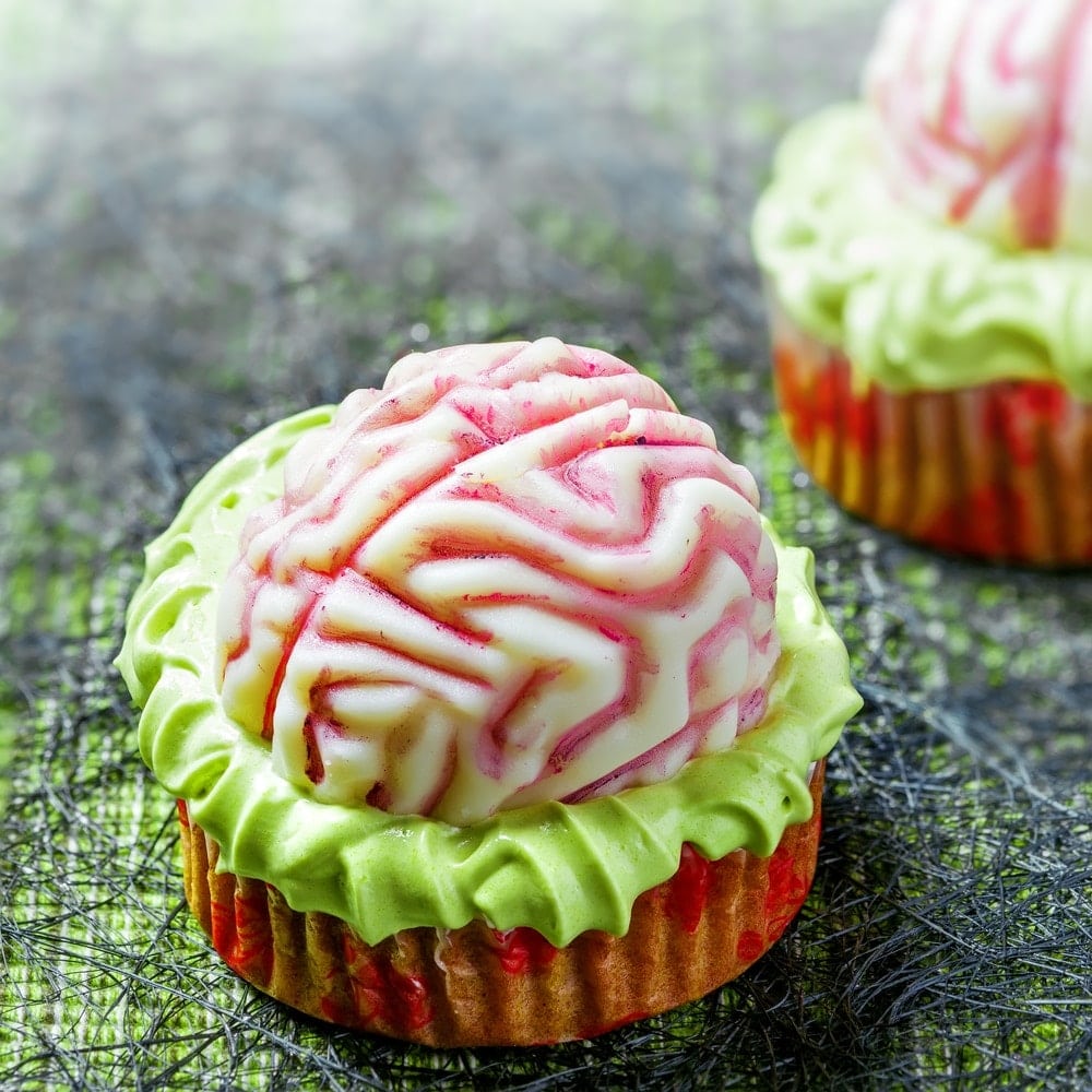 Deliciosos cupcakes en forma de cerebro, ideales para las fiestas de Halloween.